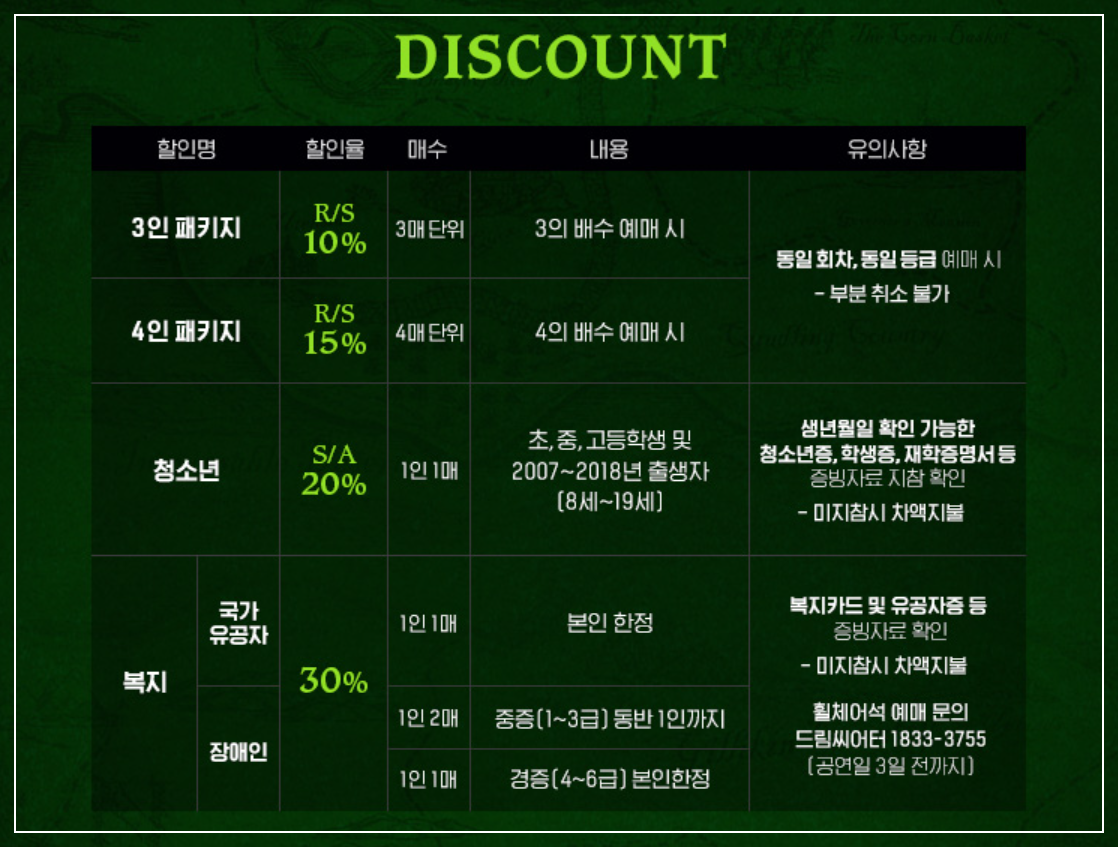 할인 혜택도 있습니다. 10월 31일까지 예매하는 경우, 1인 4매까지 조기 예매 10% 할인이 제공됩니다. 또, 장애인 및 국가유공자를 위한 복지 할인도 30%까지 적용됩니다. 본인 확인 가능한 신분증이나 증빙서류는 공연 당일 꼭 지참하셔야 해요.