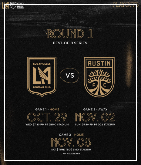 LAFC가 오스틴과의 1라운드(3전 2선승제)에서 승리하게 되면(10월 30일, 11월 3일, 8일), 다음 경기(컨퍼런스 준결승)에서는 밴쿠버와 달라스와의 승자와 단판 경기(11월 22~23일 예상)를 펼쳐요. 또 승리하게 되면 컨퍼런스 결승전을 단판 경기(11월 29~30일)로 진행해요.