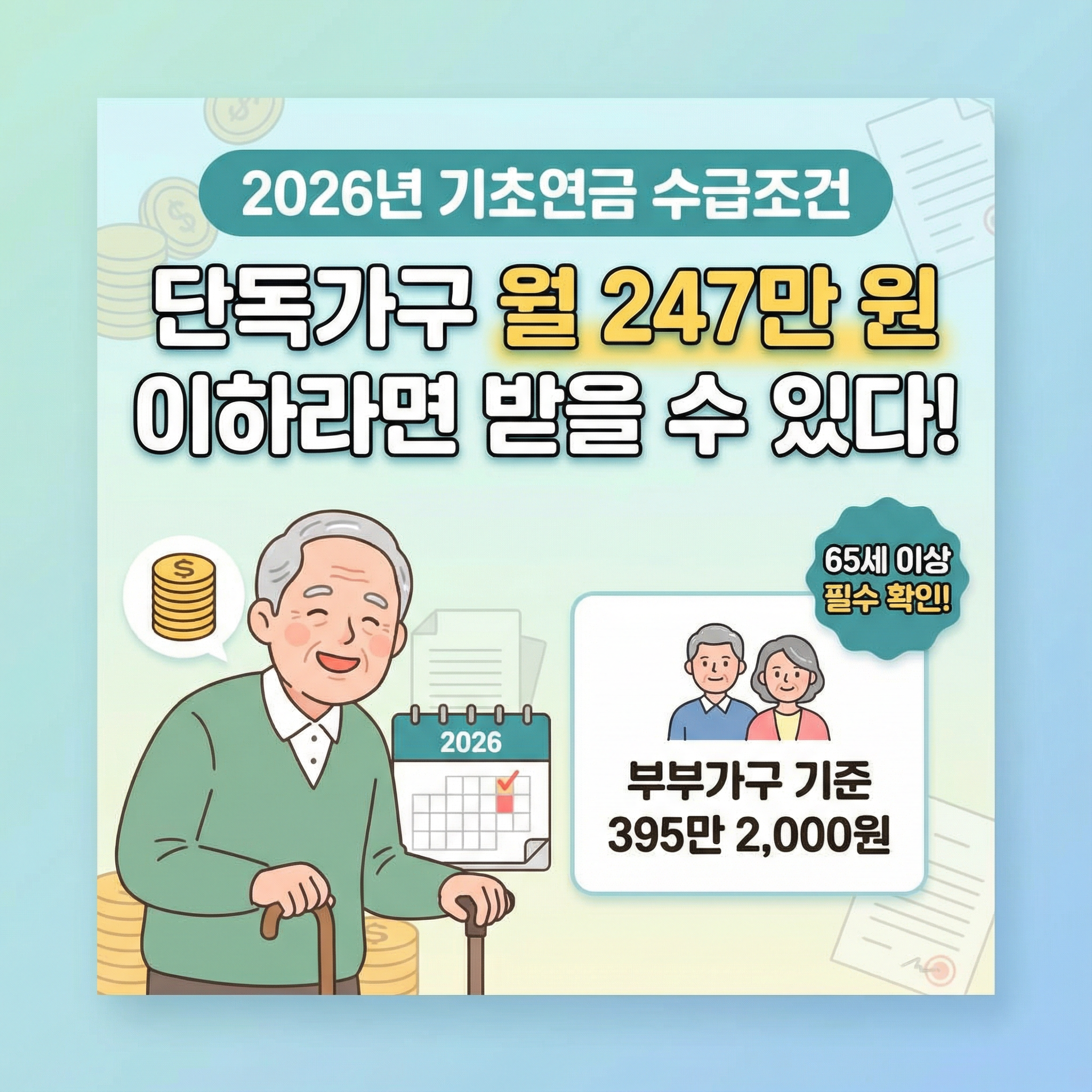 2026년부터 기초연금 수급 조건이 새롭게 바뀝니다. 특히 65세 이상 노인을 둔 가정이라면, 이번 변경 내용을 꼭 확인하셔야 합니다. 보건복지부는 2026년부터 기초연금의 월 소득인정액 기준을 단독가구 기준 247만 원, 부부가구 기준 395만 2,000원으로 상향 조정한다고 발표했습니다.