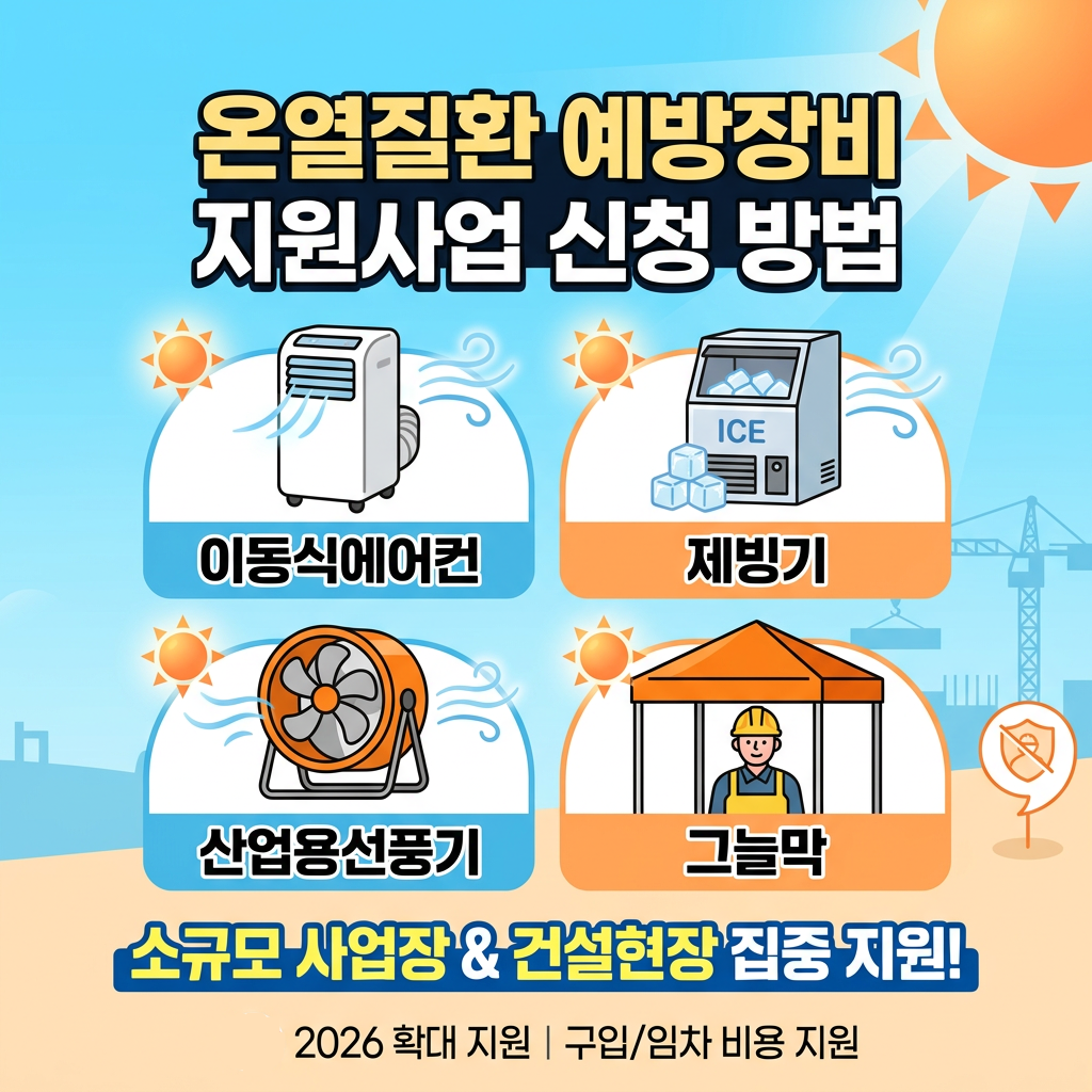 온열질환 예방장비 지원사업은 폭염에 취약한 사업장을 대상으로 이동식에어컨, 제빙기, 산업용선풍기, 그늘막 등 장비 구입 또는 임차 비용을 지원하는 제도예요. 특히 소규모 사업장과 건설현장에서는 여름철 작업환경이 매우 열악하기 때문에 정부가 비용 일부를 지원해 안전한 작업 환경을 만들도록 돕는 사업입니다. 2026년에는 지원 규모가 확대되고 소규모 건설현장 임차비 지원이 새로 추가되면서 관심이 높아지고 있어요.