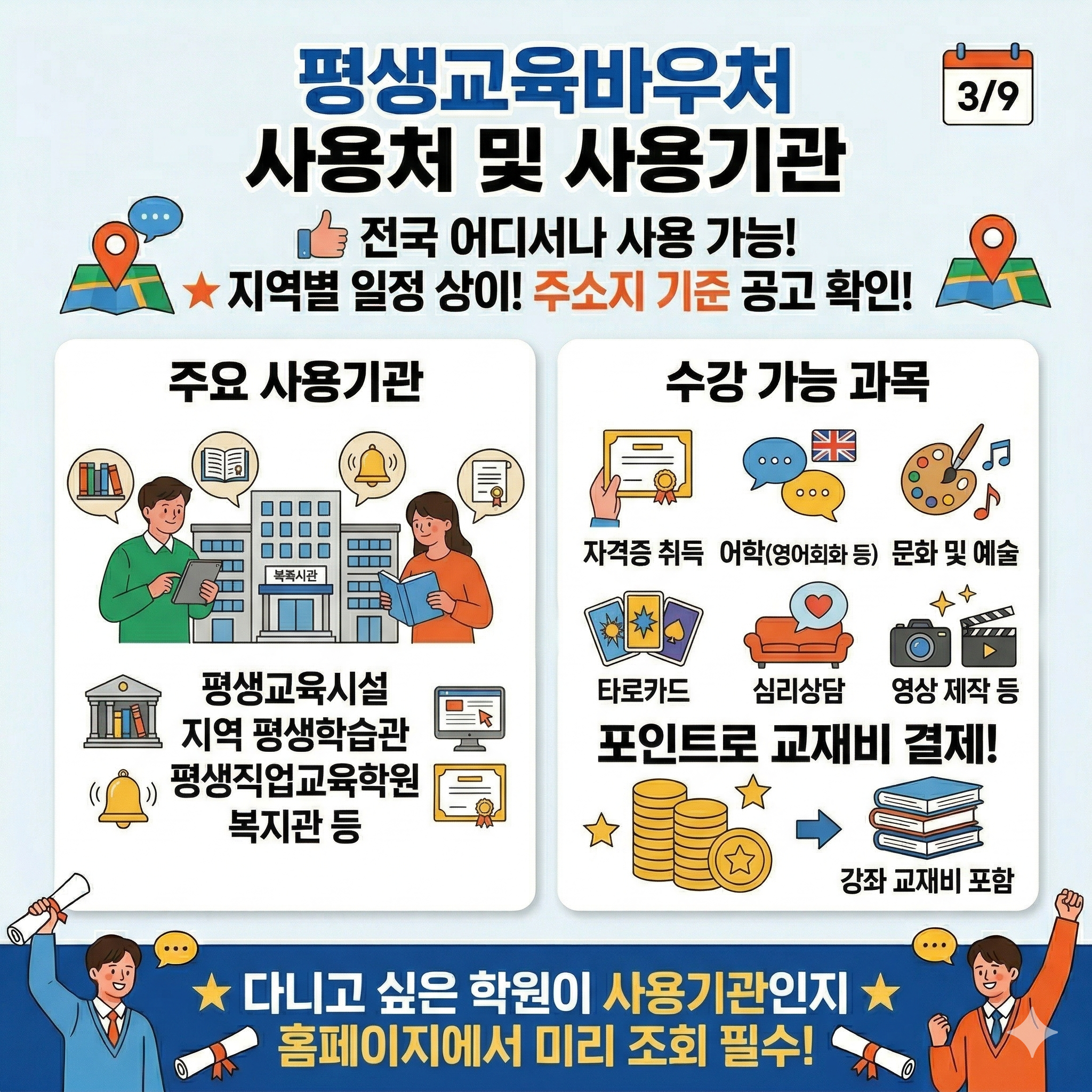 마지막으로 평생교육바우처는 현금으로 출금할 수 없으며, 반드시 지정된 평생교육바우처 카드로만 결제해야 한다는 점 잊지 마세요. 사용 기간 내에 쓰지 않은 평생교육바우처 포인트는 자동 소멸되니 기간 안에 알차게 사용하시길 바라요.