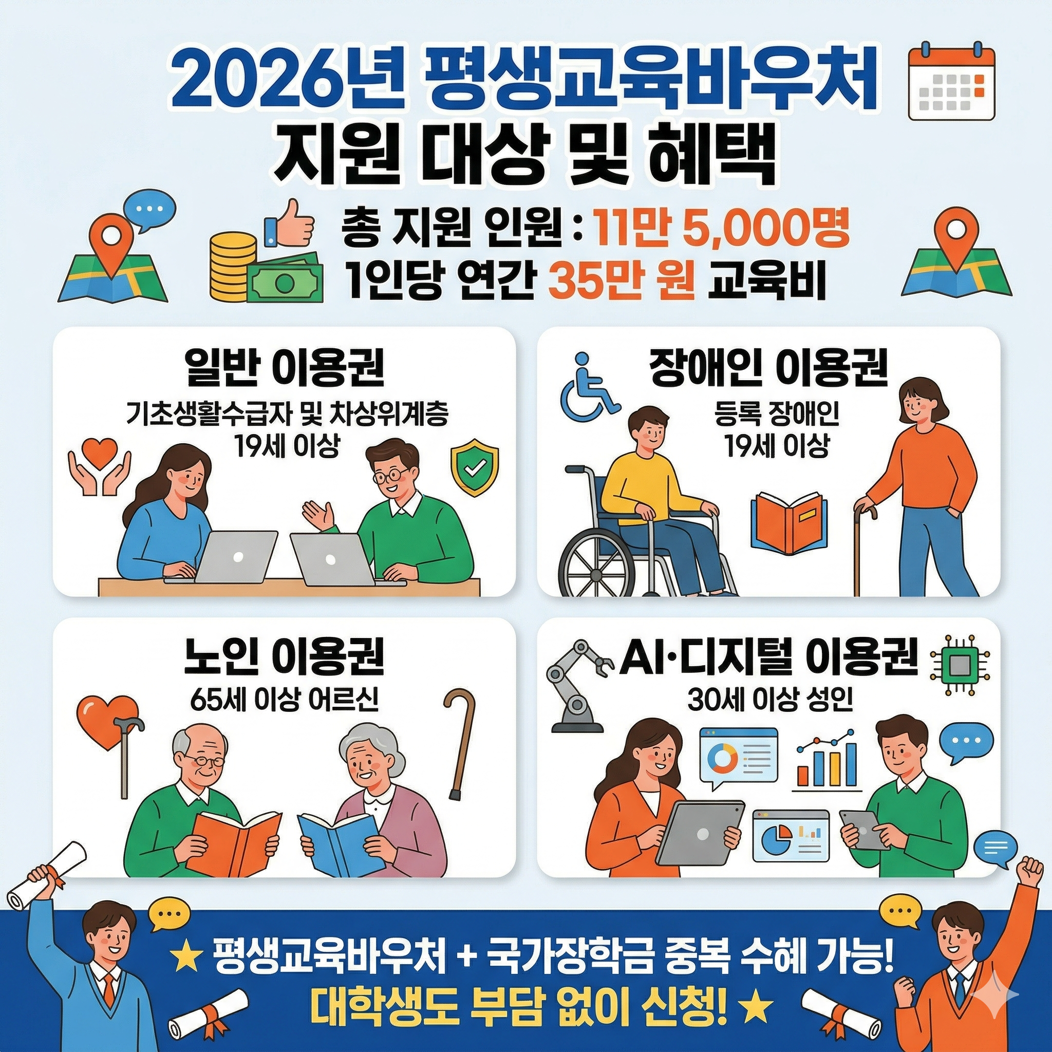 올해 평생교육바우처 사업은 총 11만 5,000명을 지원하며, 선정 시 1인당 연간 35만 원의 교육비를 지원받을 수 있어요. 평생교육바우처 대상은 크게 네 가지로 나뉩니다.