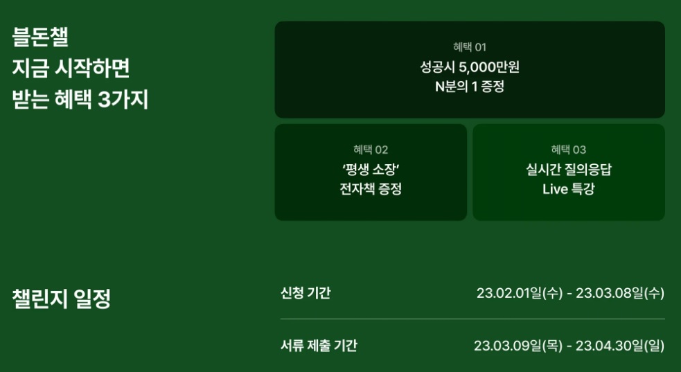 블로그로 돈벌기 챌린지를 성공하면 5천만 원 N분의 1 증정 외에 평생 소장 전자책, 실시간 질의응답 Live 특강 등도 있습니다. 신청은 3월 8일까지입니다. 블로그를 운영하는 데에 있어서 망설이는 분들에게는 강한 동기부여가 될 것 같습니다. 저도 제 아내를 비롯해 지인 몇 명에게 교육을 수강해 보라고 추천을 했습니다.
