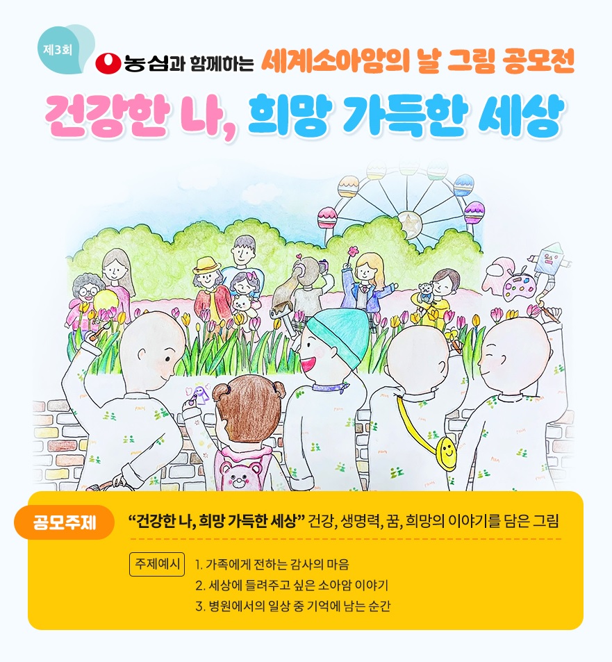 그림 공모전은 "건강한 나, 희망 가득한 세상"을 주제로 19세 이하의 소아암 및 희귀혈액질환 경험자를 대상으로 합니다. 1인당 2작품까지 제출이 가능하고요, 총 100명의 수상자를 뽑습니다. 접수는 3월 17일까지입니다.