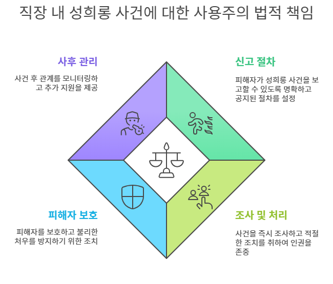 사업주는 성희롱 사건 처리 후에도 피해자에 대한 2차 피해가 발생하지 않도록 지속적으로 모니터링하고 필요한 교육 및 사후 조치를 취해야 해요. 이를 소홀히 할 경우, 법적 책임이 따를 수 있어요.