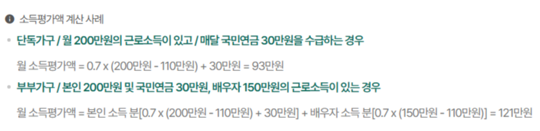 월 소득평가액 = 0.7 x (200만원 - 110만원) + 30만원 = 93만원