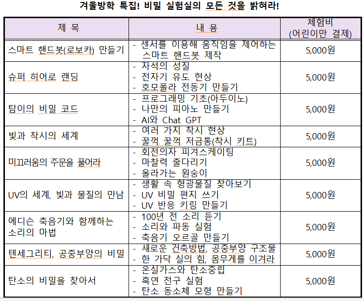 겨울방학을 맞아 초등학생 아이와 함께 유익하면서도 즐거운 시간을 보낼 곳을 찾고 계신가요? 국립중앙과학관의 특별한 과학 체험 프로그램, 「비밀 실험실의 모든 것을 밝혀라!」를 소개해 드릴게요. 어린이들의 상상력과 호기심을 자극하는 과학실험 콘텐츠가 한 곳에 모여있답니다.