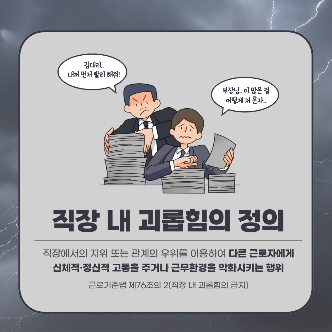 근로기준법 제76조의 2에 따라 괴롭힘은 다음 조건을 모두 만족할 때 성립해요.