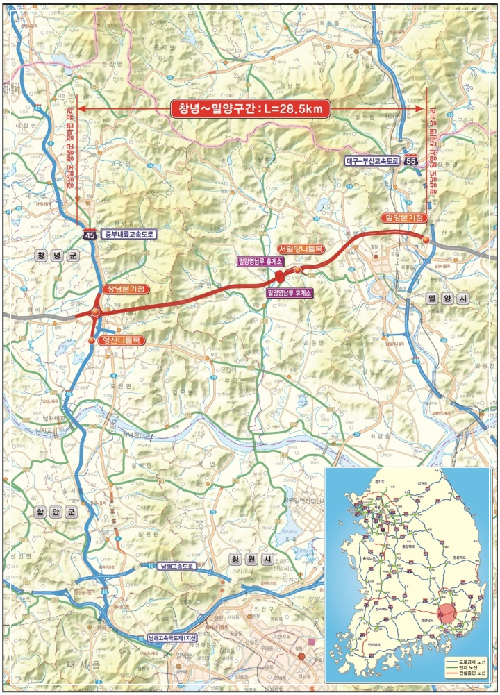- 창녕군 장마면 ↔ 밀양시 산외면, 총 28.5㎞ 구간이에요. 사업비는 약 1조 6832억 원이 투입됐다고 해요.