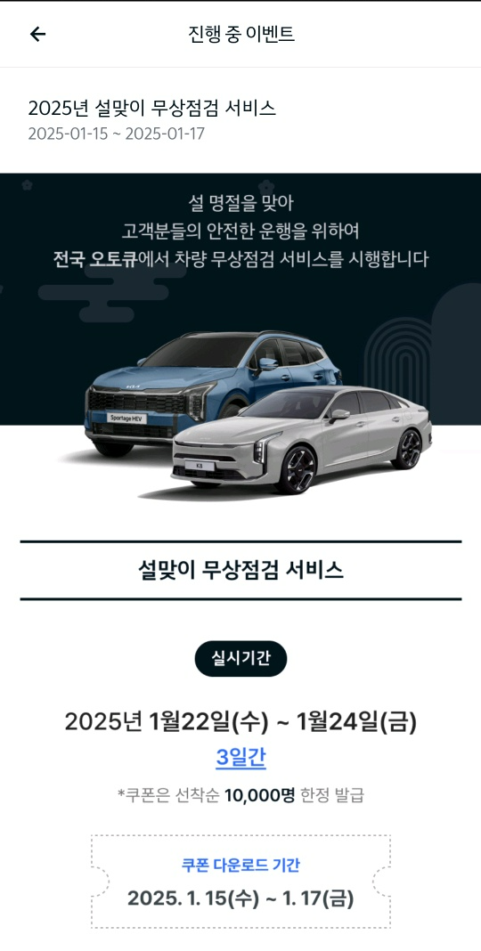 다가오는 설 연휴를 맞아 현대자동차와 기아자동차가 고객의 안전하고 편안한 귀성길을 지원하기 위해 특별 무상점검 서비스를 실시합니다. 이번 서비스는 1월 22일(수)부터 24일(금)까지 사흘간 전국 서비스 거점에서 제공됩니다. 귀성길을 앞두고 차량 점검이 필요하다면 이번 기회를 꼭 활용해 보세요.