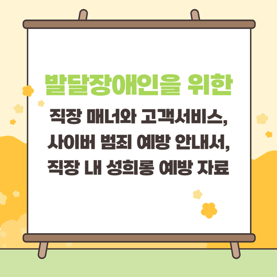 발달장애인의 정보 접근성을 높이고 안정적인 직장생활을 돕기 위해 한국장애인고용공단 고용개발원이 개발한 ‘직장 매너와 고객서비스’, ‘사이버 범죄 예방 안내서’, ‘직장 내 성희롱 예방’ 등 알기 쉬운 자료 3종에 대해 소개해 드릴게요. 발달장애인 분들은 직장 내에서 의사소통, 디지털 기기 사용, 성희롱 예방 등 다양한 문제를 겪을 수 있습니다. 이에 따라 쉽고 이해하기 쉬운 자료를 제공하여 직장 적응을 돕고, 안전한 근무 환경을 조성하는 것이 중요합니다.