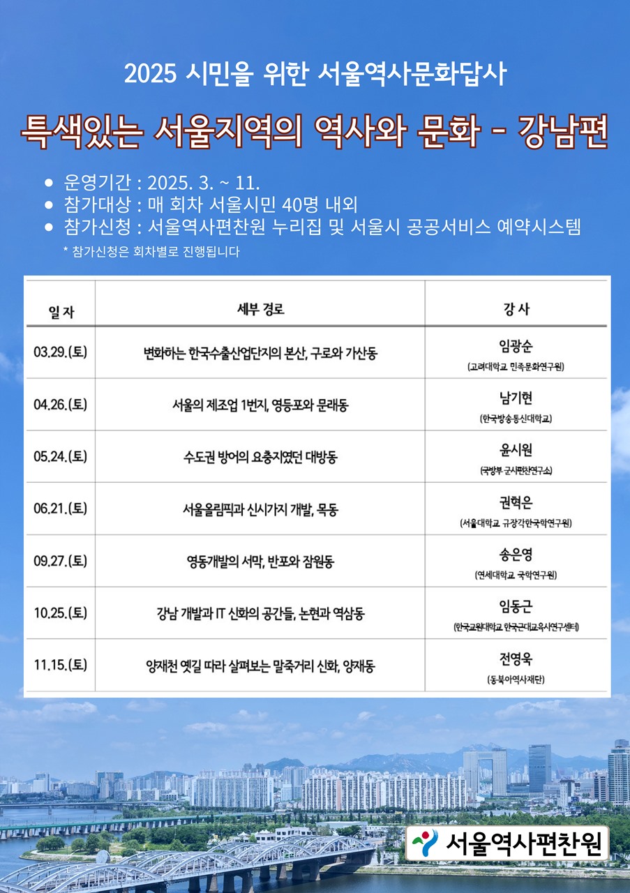 역사학자와 함께하는 2025 서울역사문화답사 참가자를 모집해요. 서울 곳곳을 직접 걸으며 역사와 문화를 체험할 수 있는 기회! 서울역사편찬원이 주관하는 2025 서울역사문화답사 첫 참가자를 3월 12일부터 21일까지 모집합니다.